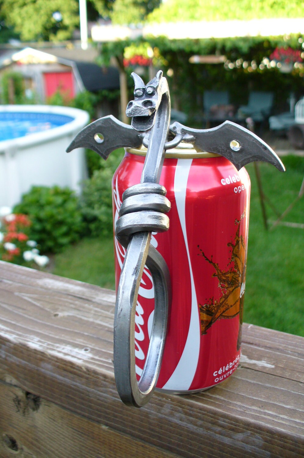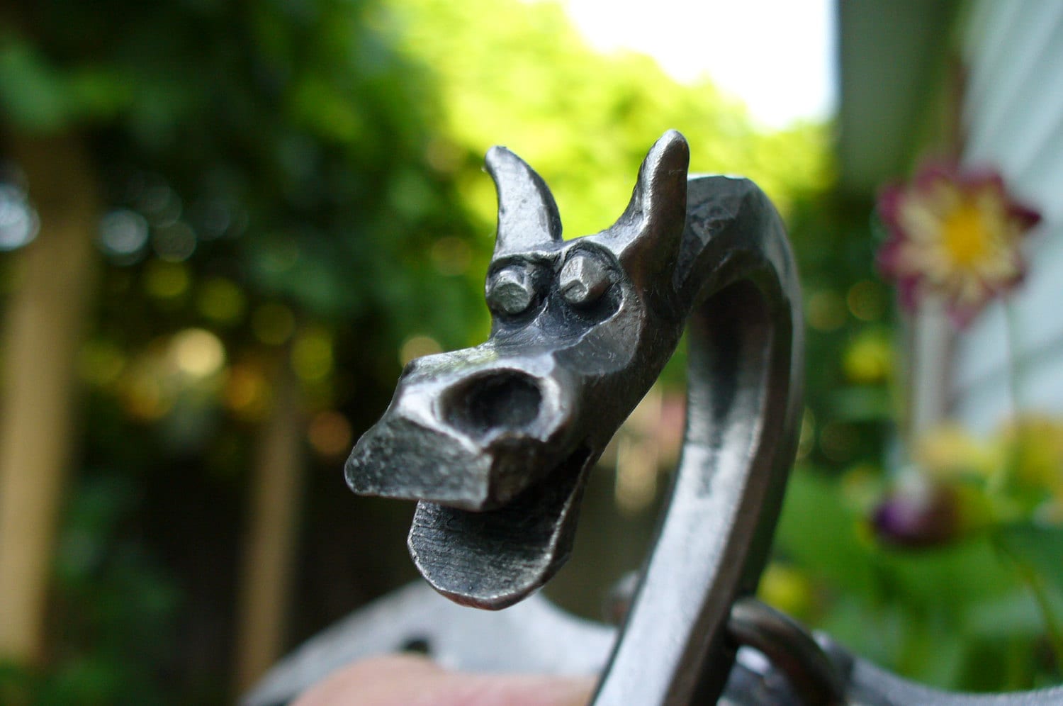 The dragon started out as 1/4" solid square stock iron and came to life on the anvil under the hammer blows at a yellow/orange heat. Details were then added using hand held punches that I made (eye punch, nostril punch, etc...).