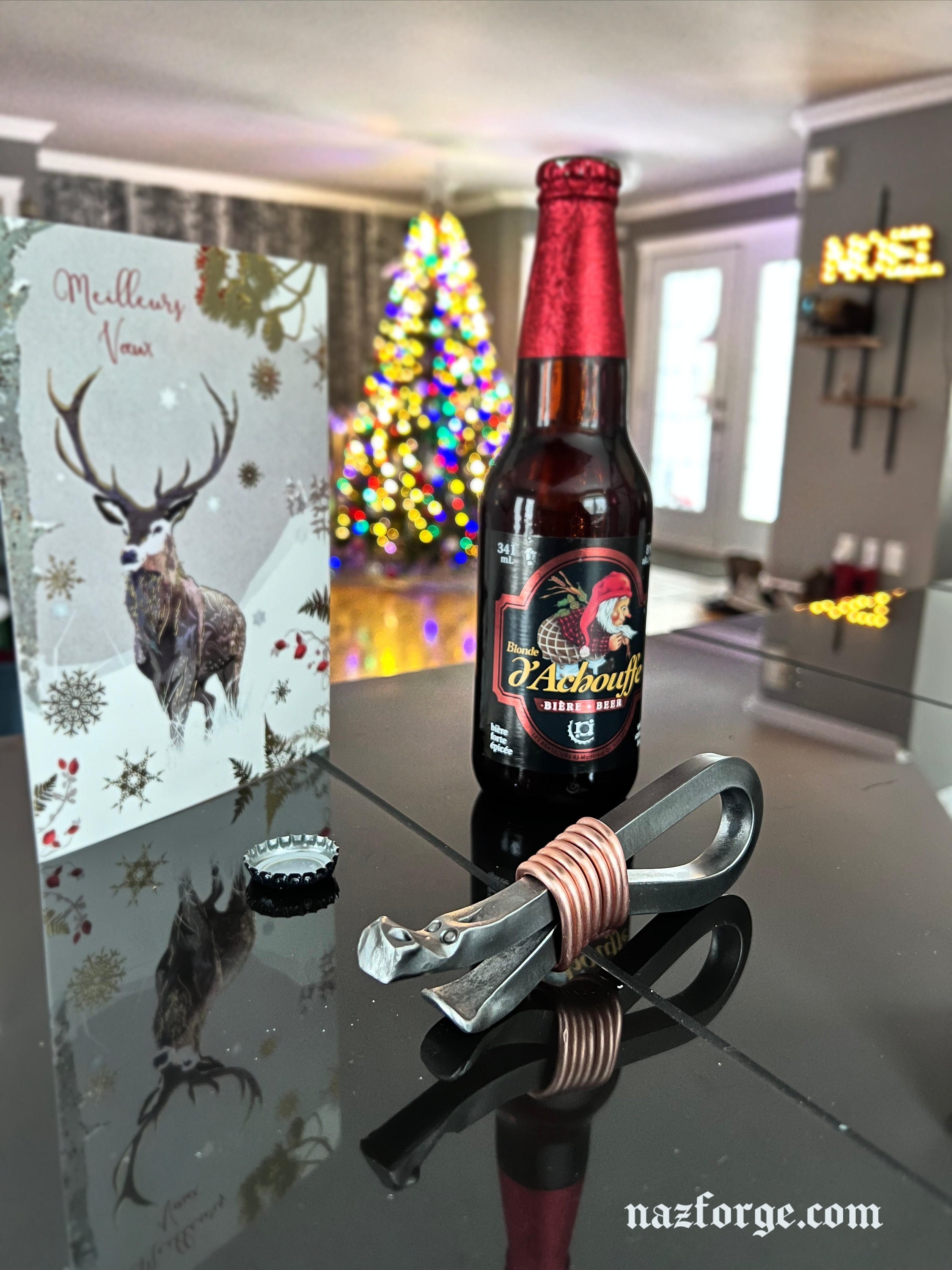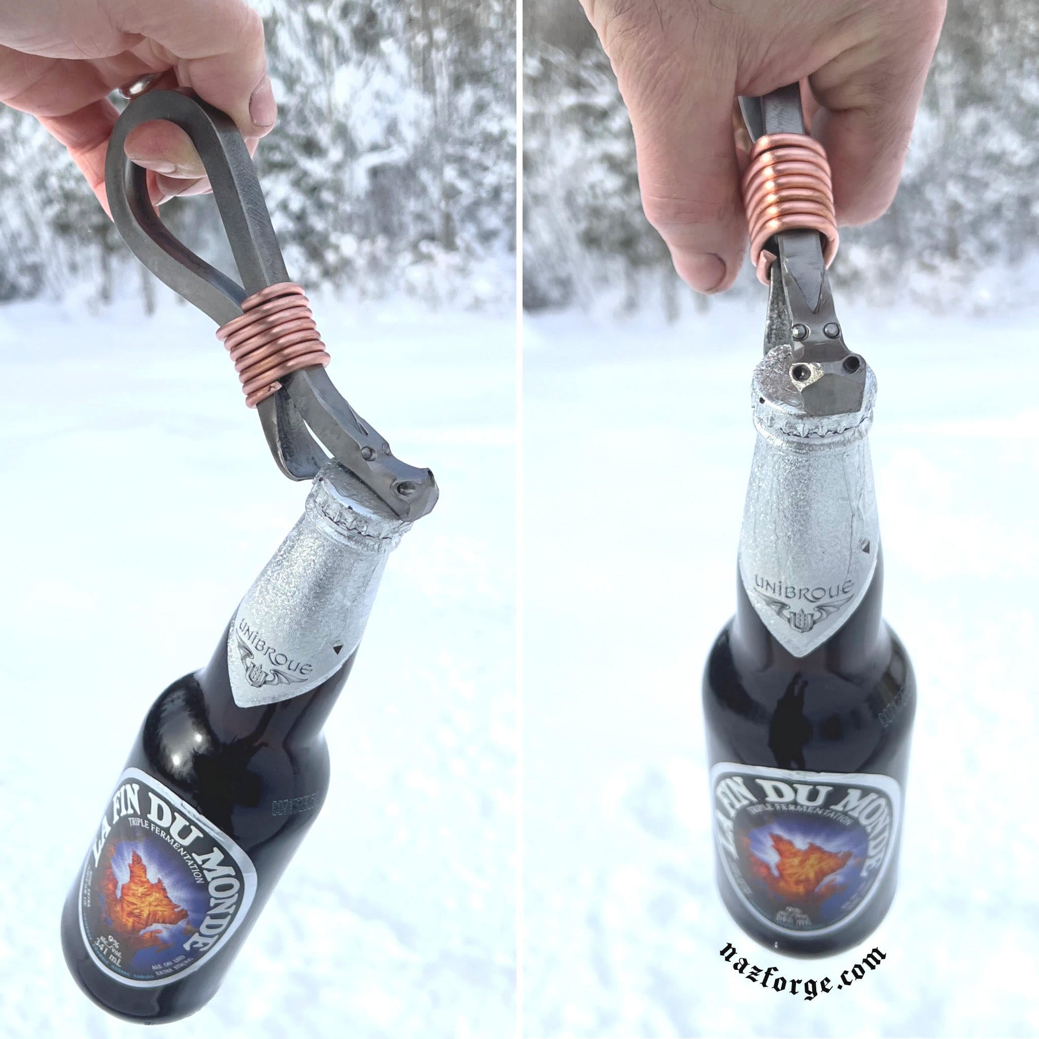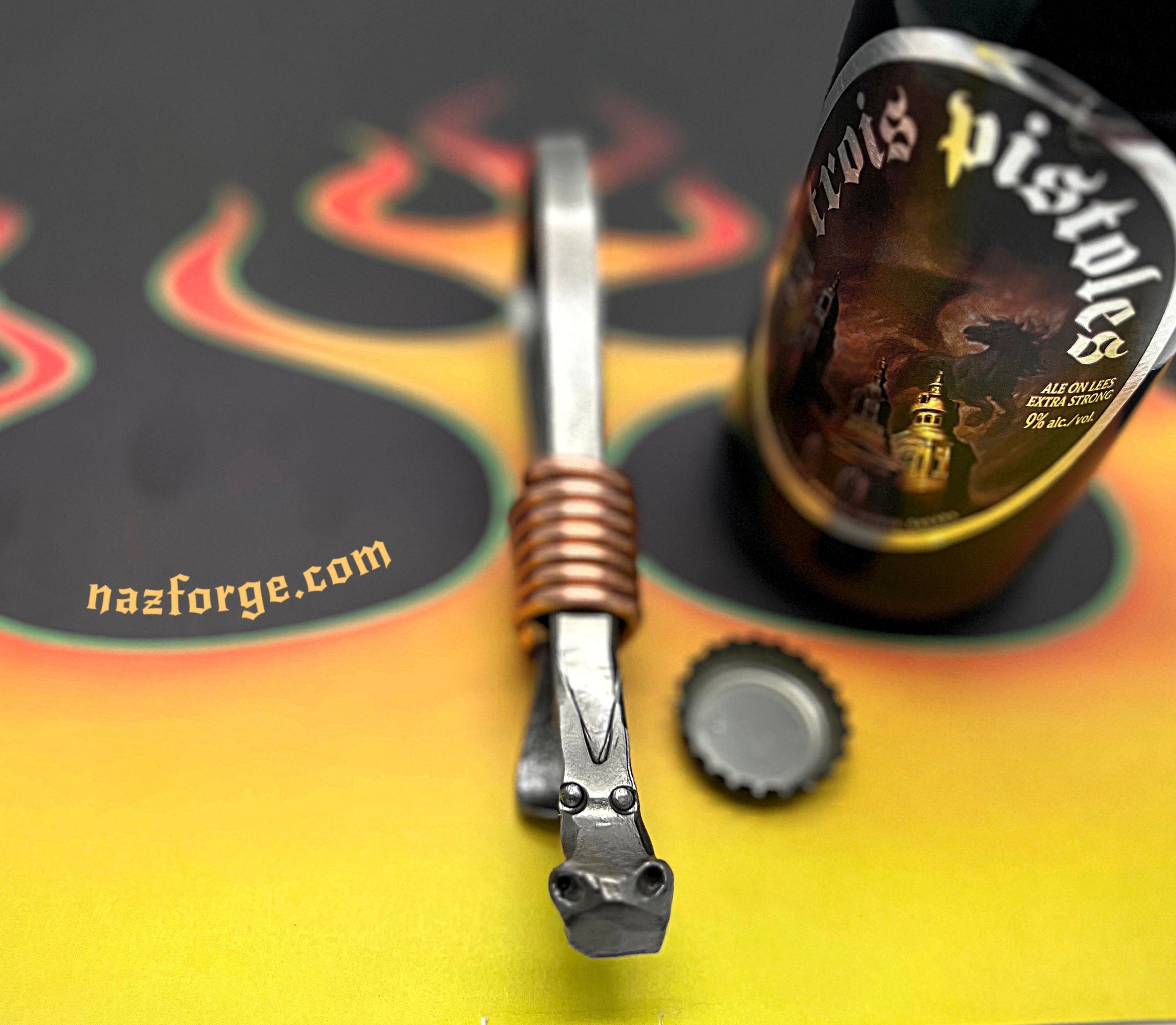 On one end of the bottle opener is a hand forged dragon head that rests it's jaw on top of the cap for leverage when you pull up on the opener.