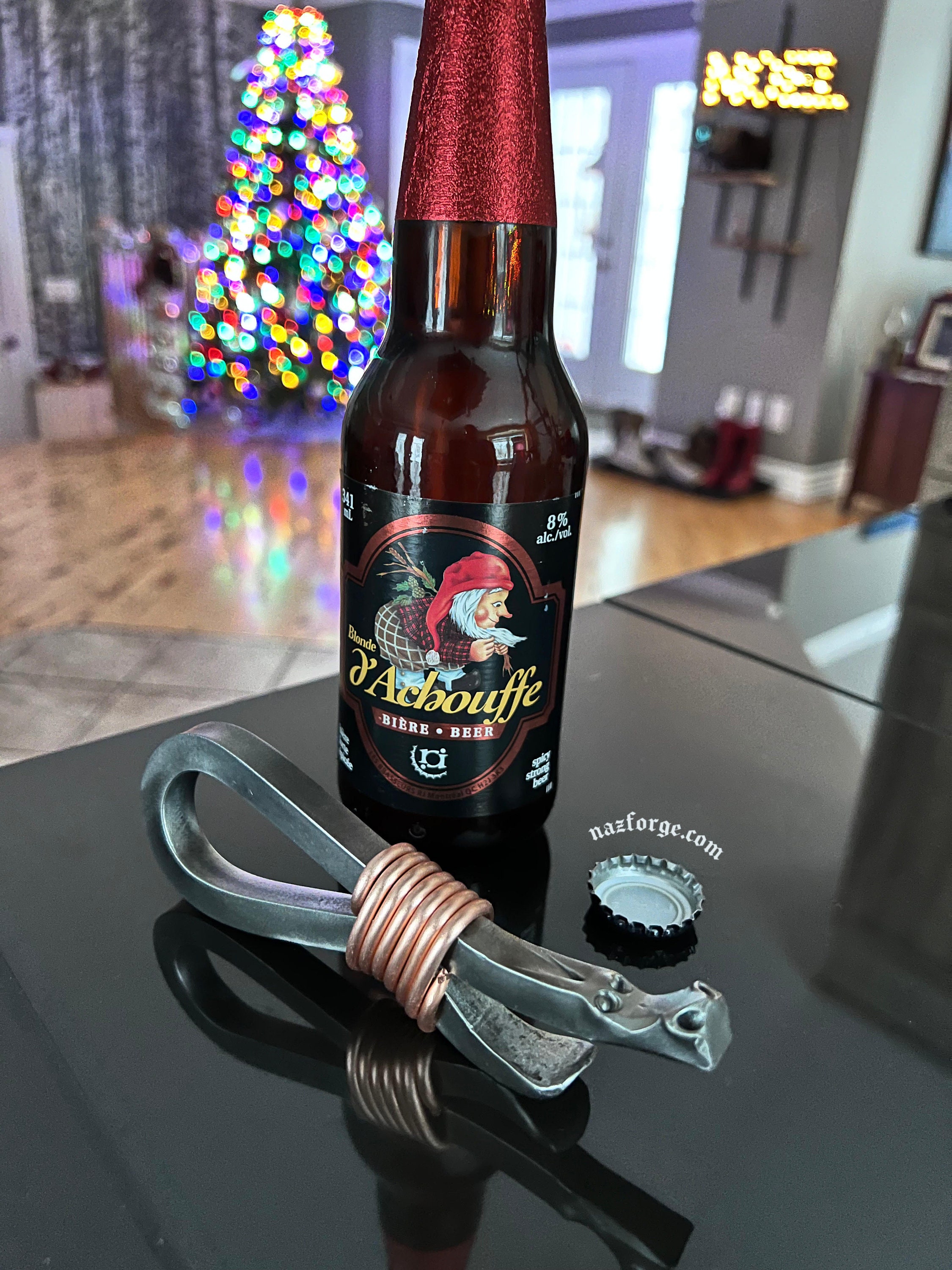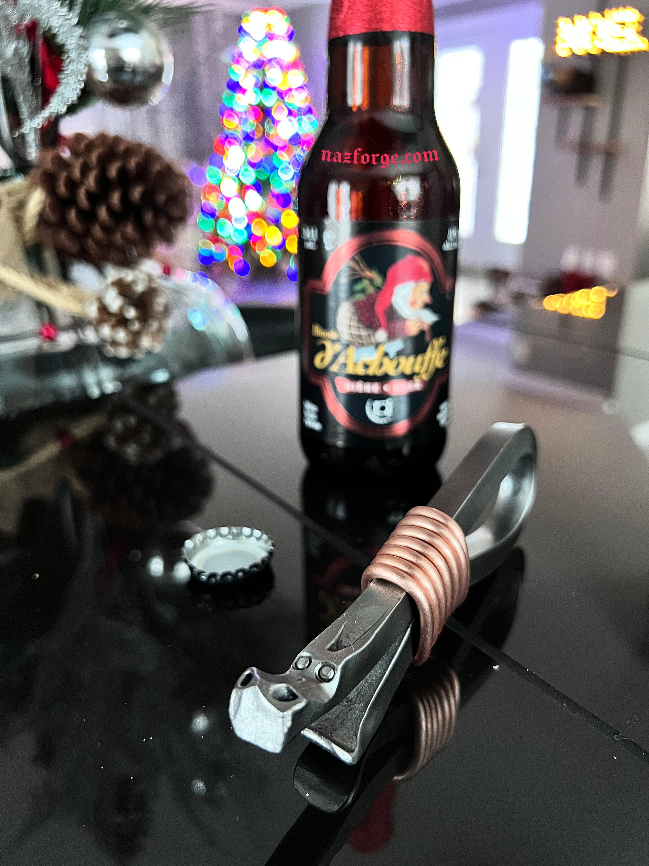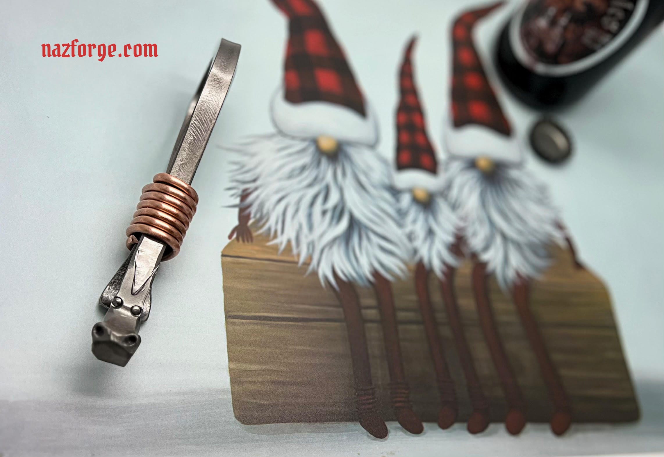 This heavy duty hand forged dragon bottle opener shows off a decorative copper wrap on the handle.