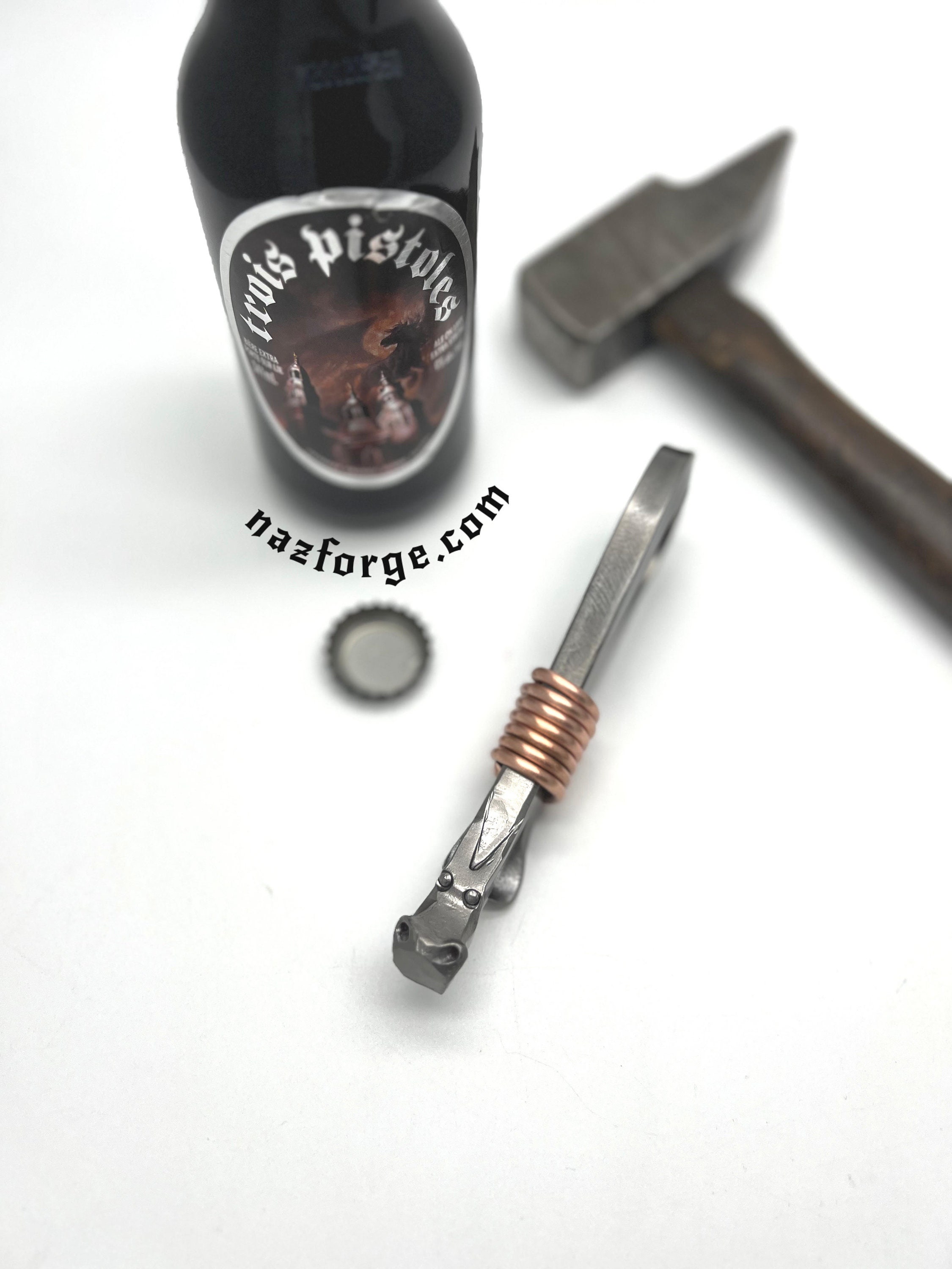 I put a lot of importance in cleaning each opener after it has been hammered, bent into shape, and "in and out" of the fire numerous times...I acheive the clean look you see in the photos by using the wire wheel and sandpaper, this leaves each opener with a clean attractive look that is perfect for gift giving...