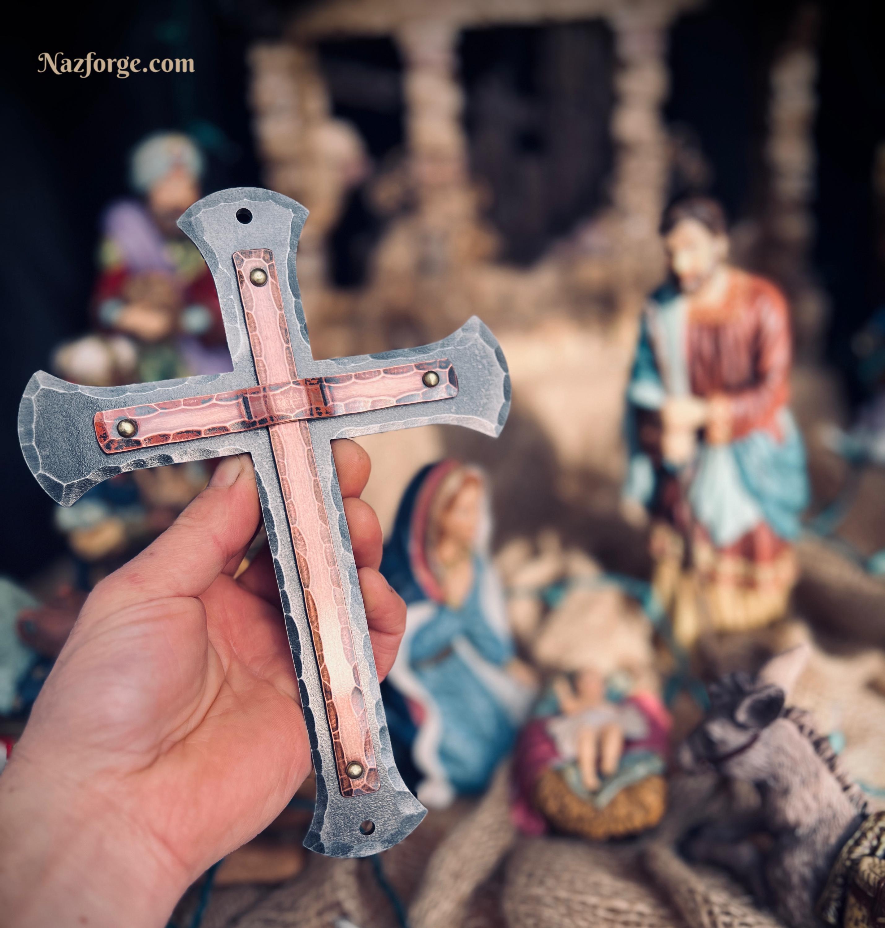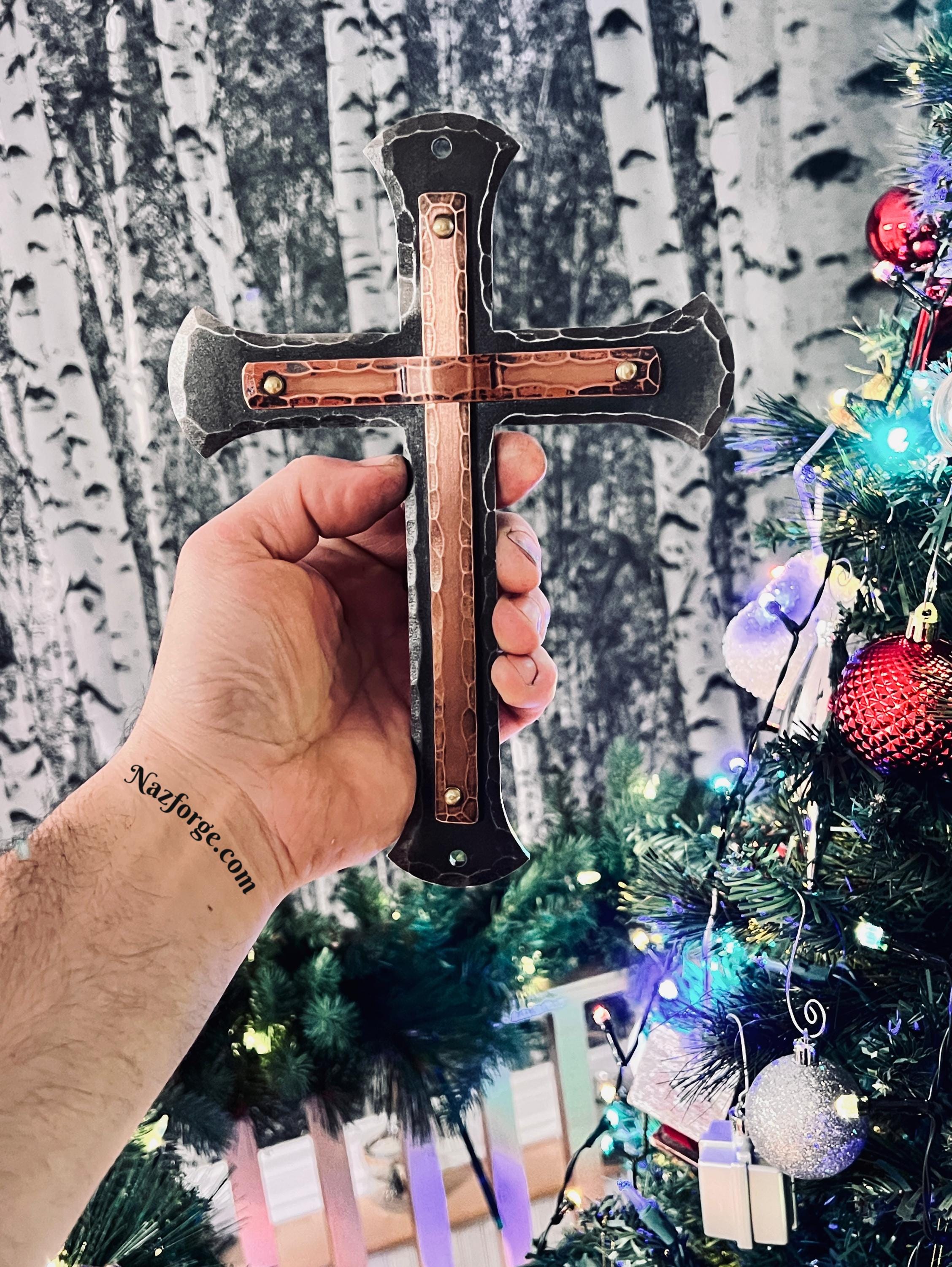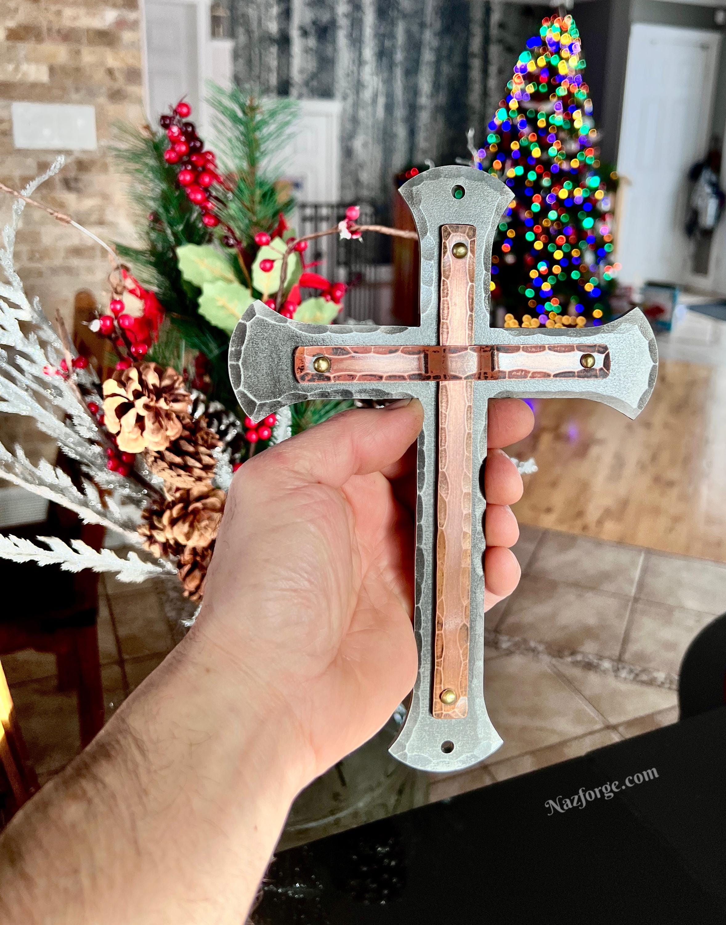 The copper cross is fixed to the Iron backplate using traditional brass hammered rivets, both the copper cross & the iron backplate are hammered around the edges, this gives this original piece it's handmade warmth that can not be achieved with a machine.