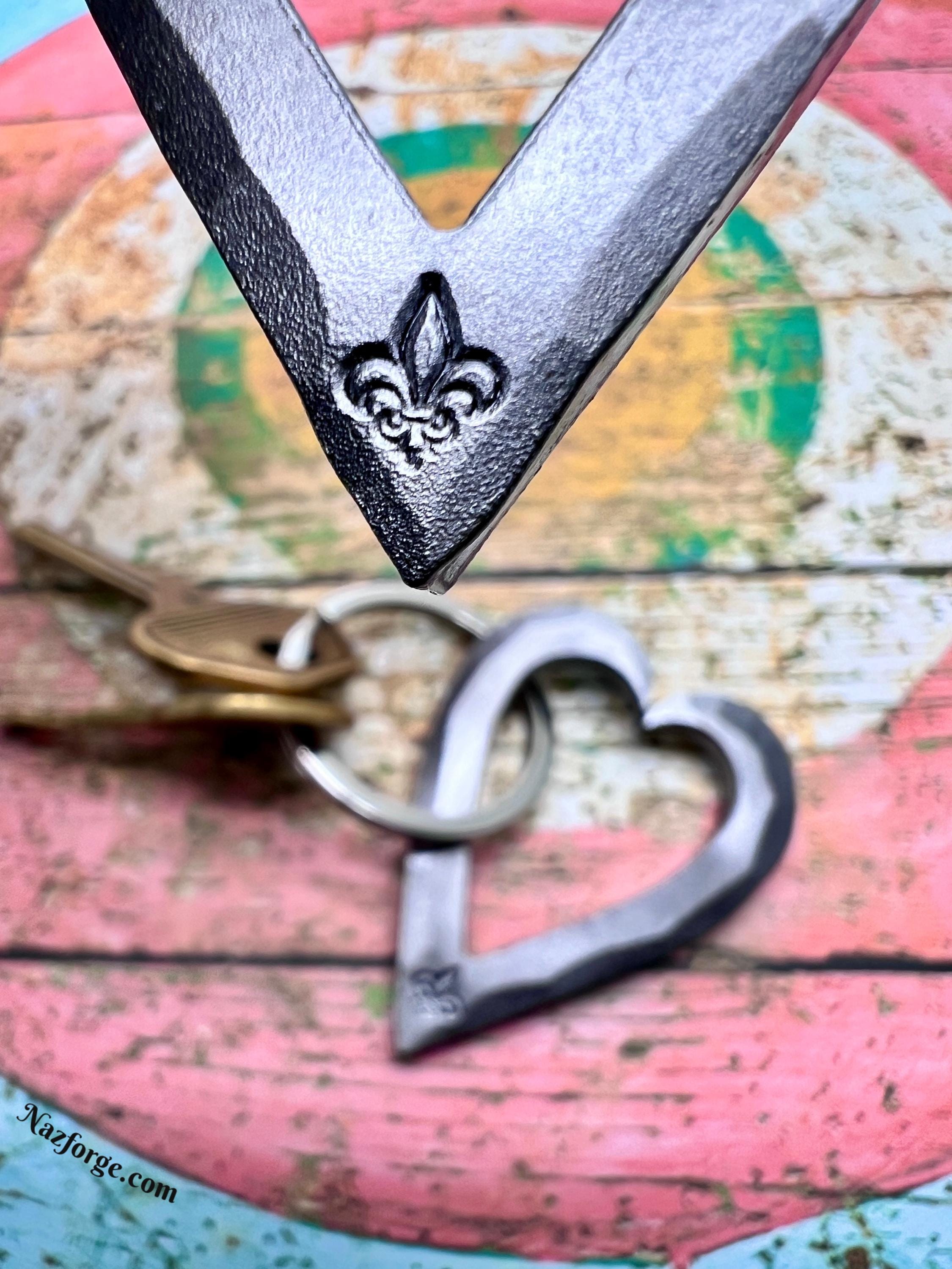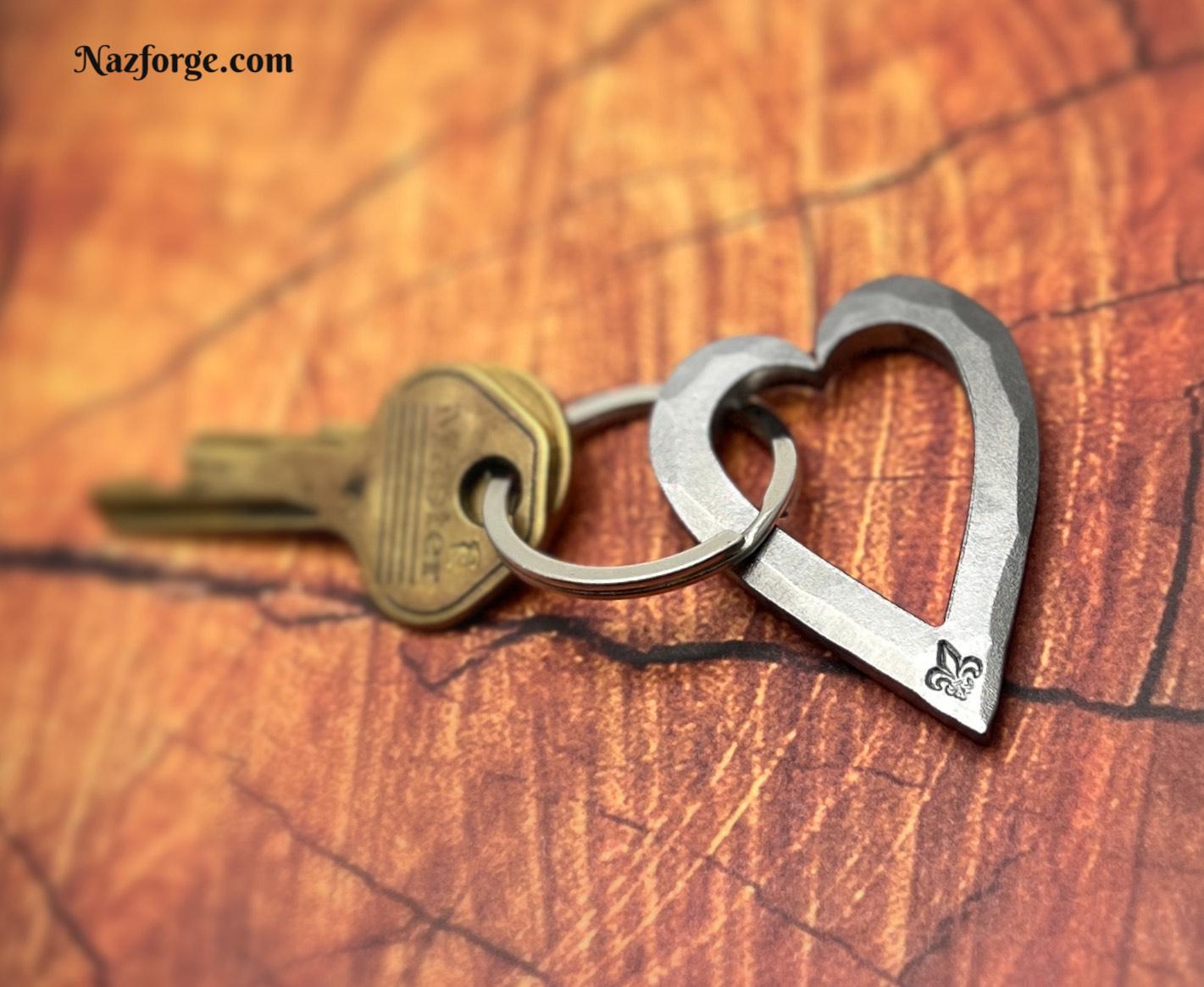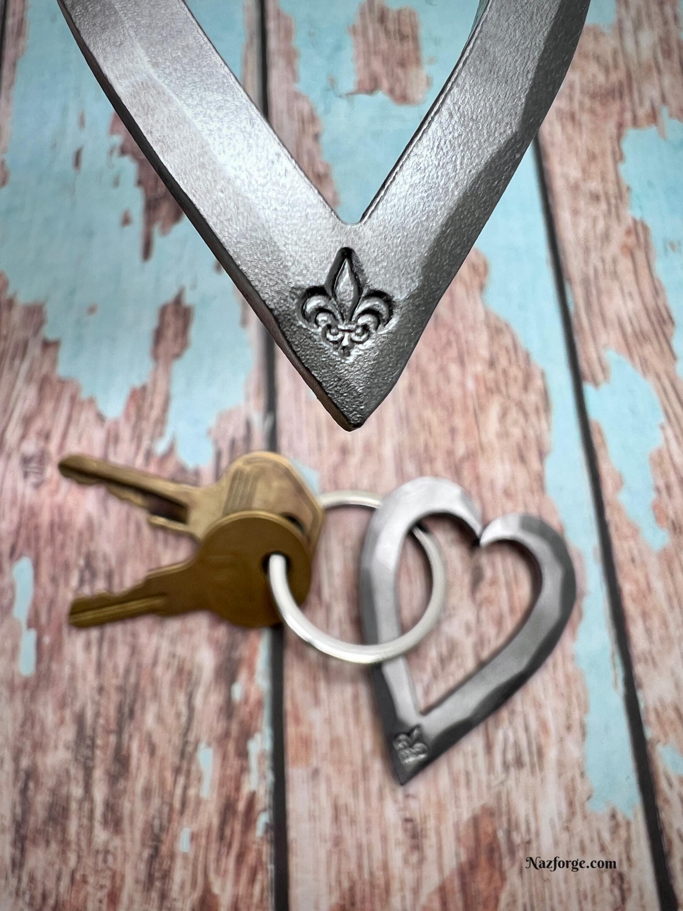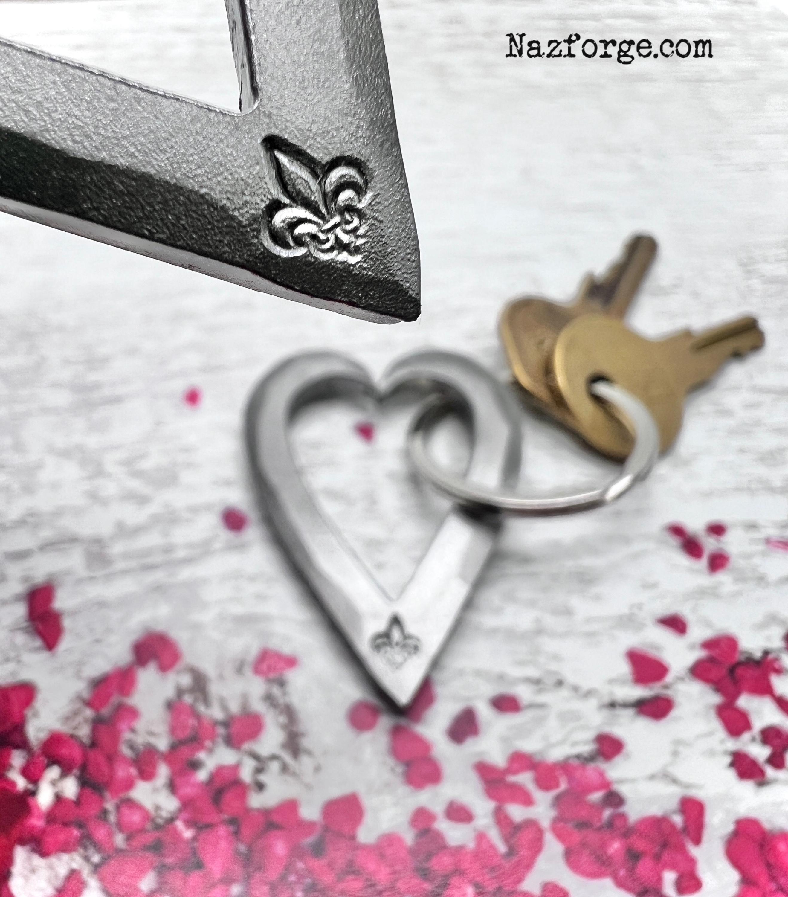 This hand forged heart keychain will last a lifetime, the heart is formed hot at the anvil, then a lily flower is stamped at the bottom.