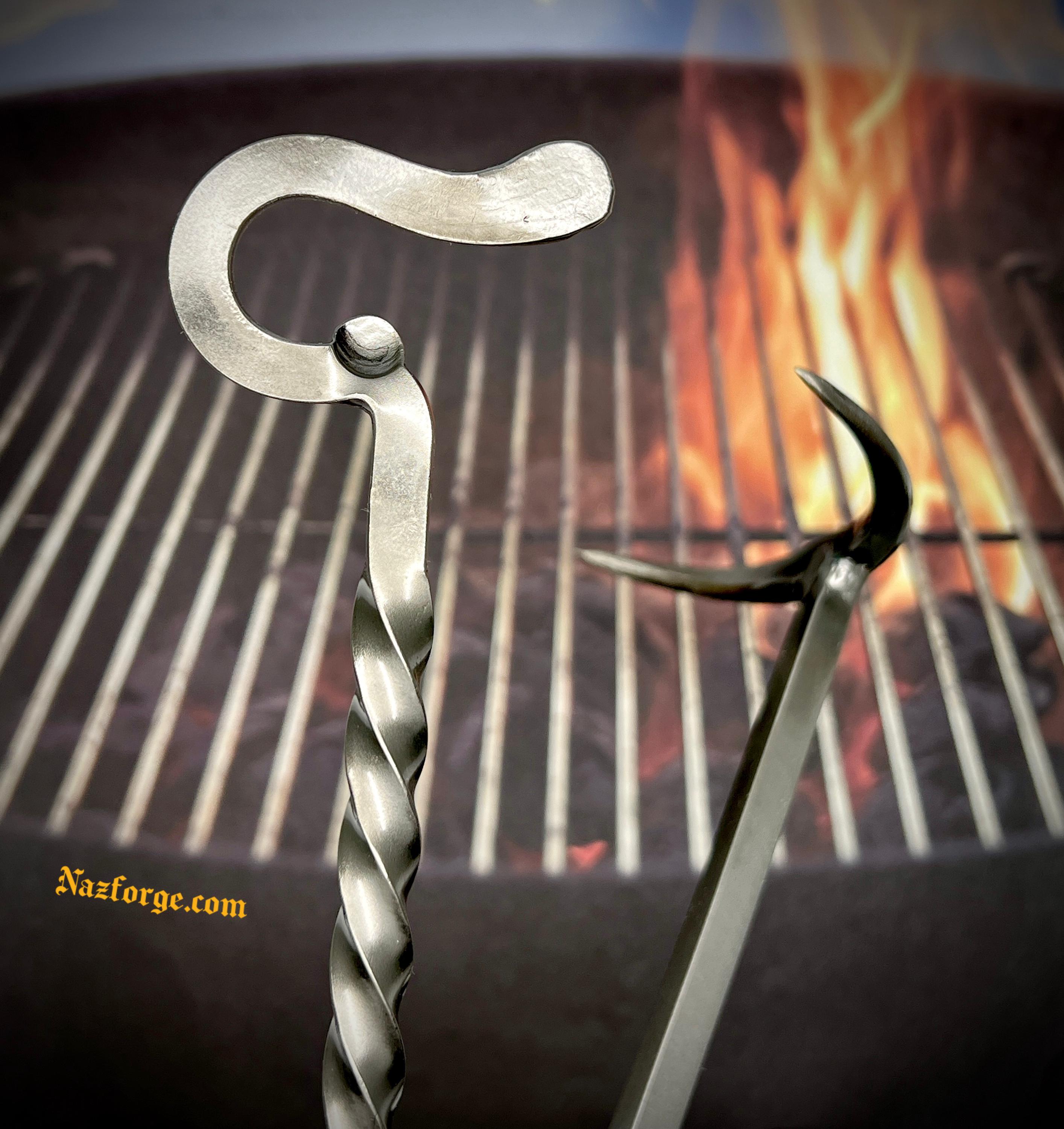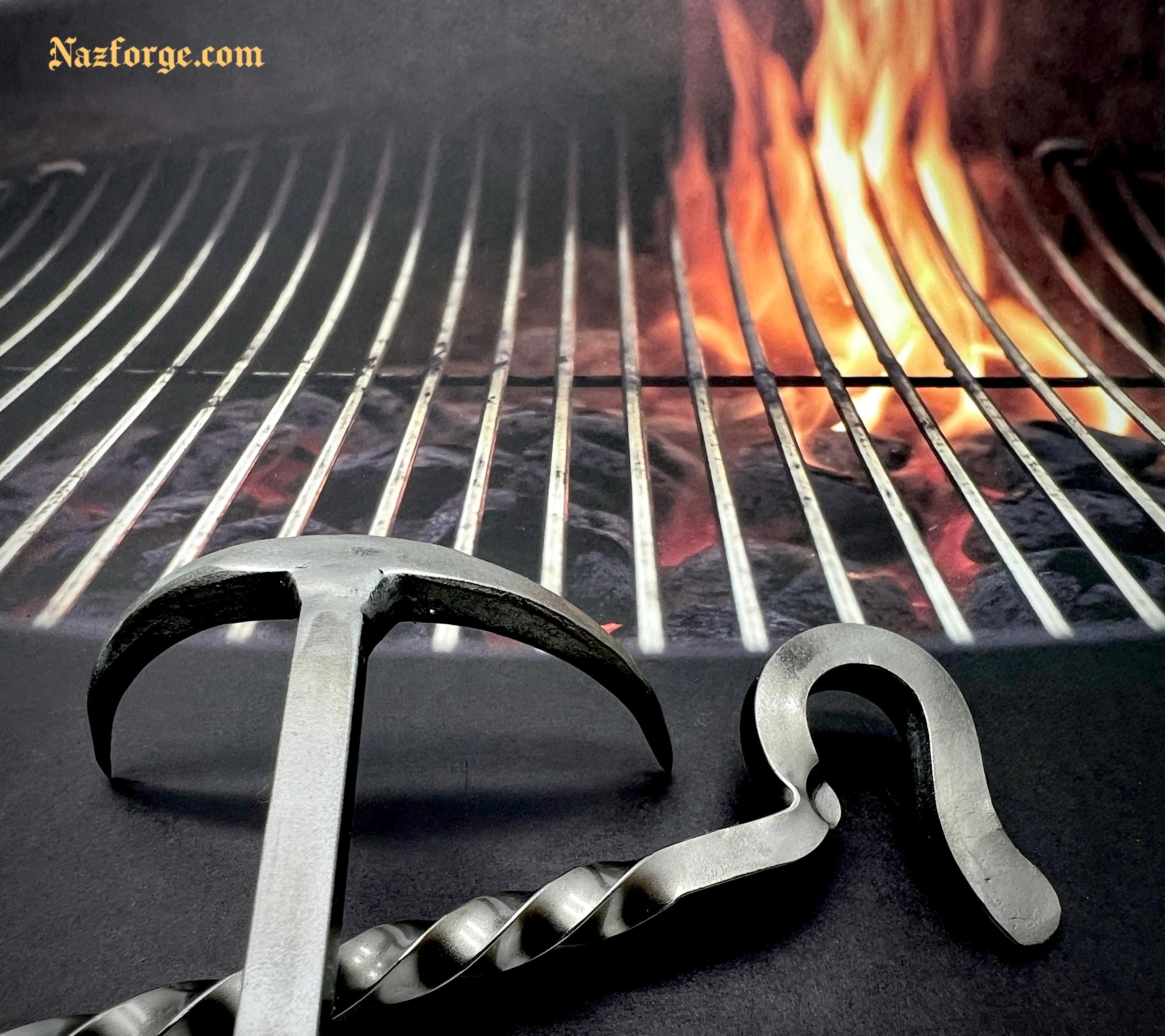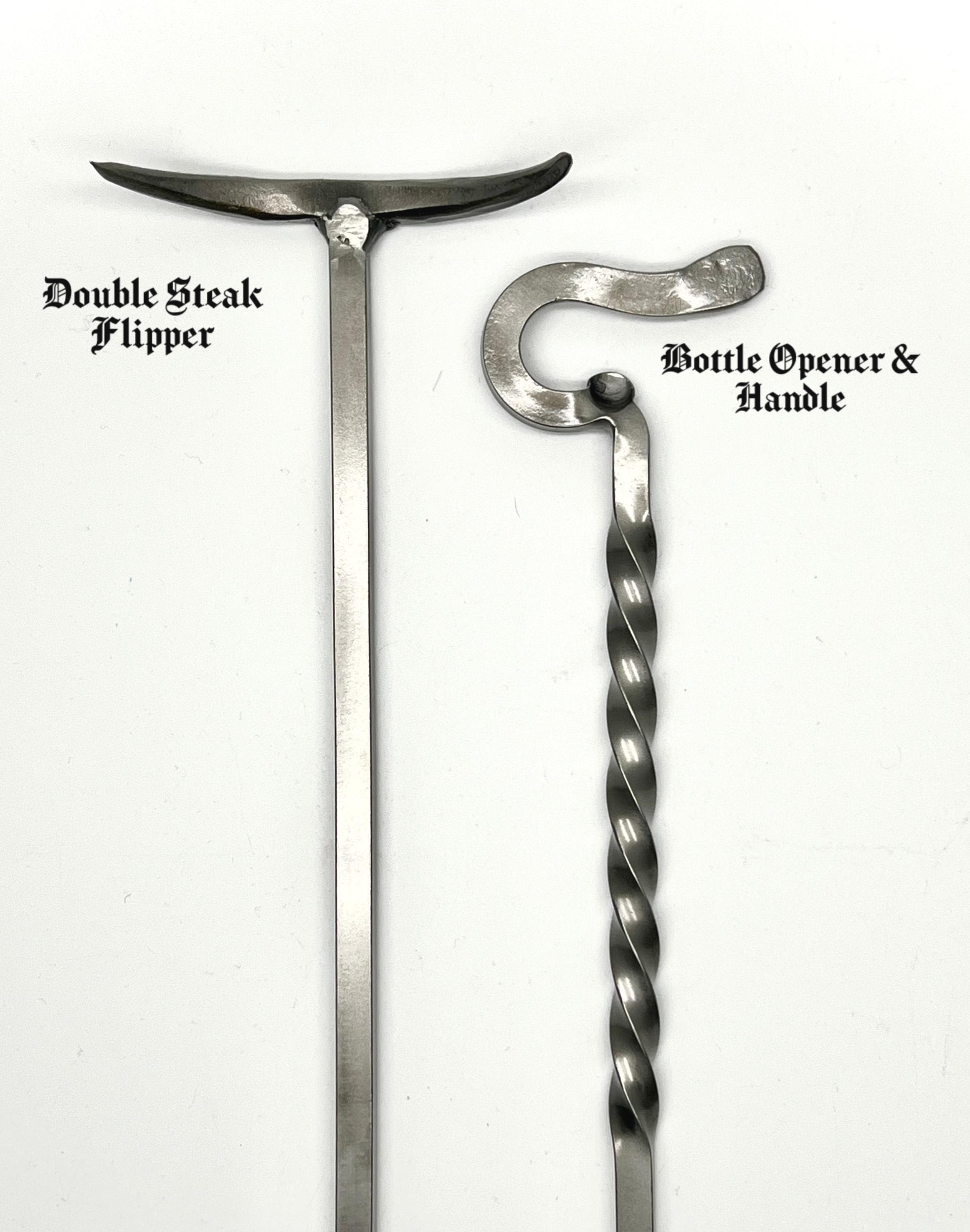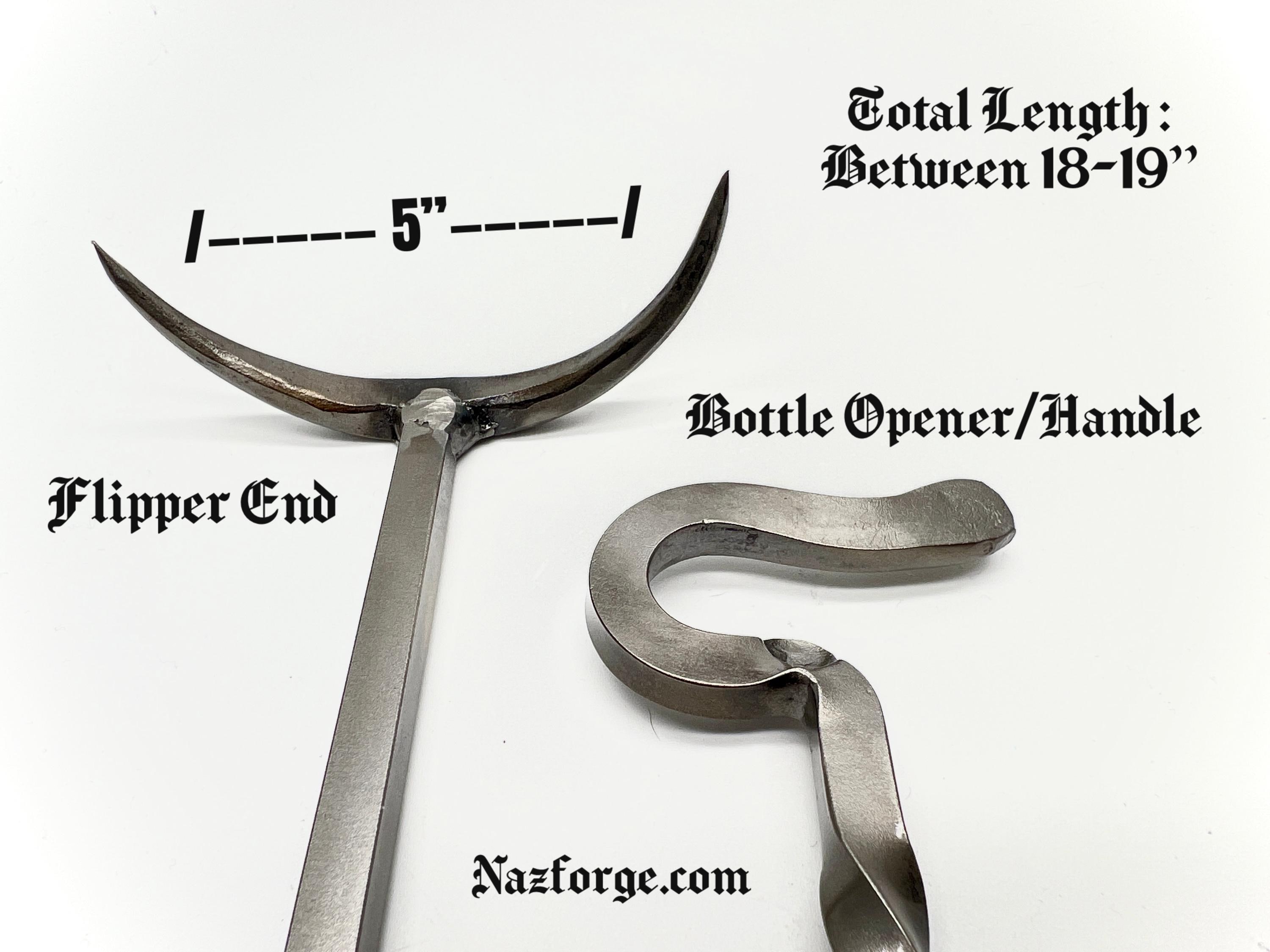 This original tool is hand forged in fire and has the versatility on one end to flip meat from the left or right side (which is perfect both for left or right handed persons) and the other end serves as a twisted handle with an incorporated bottle opener.