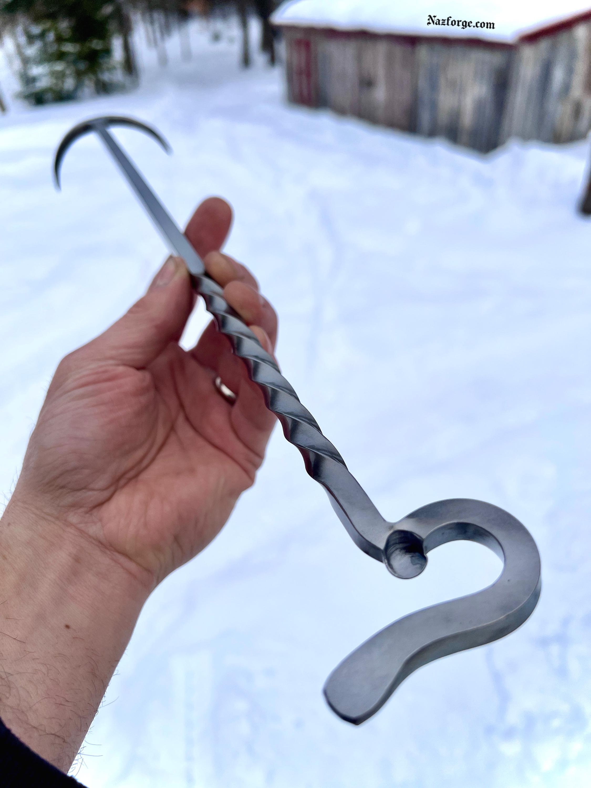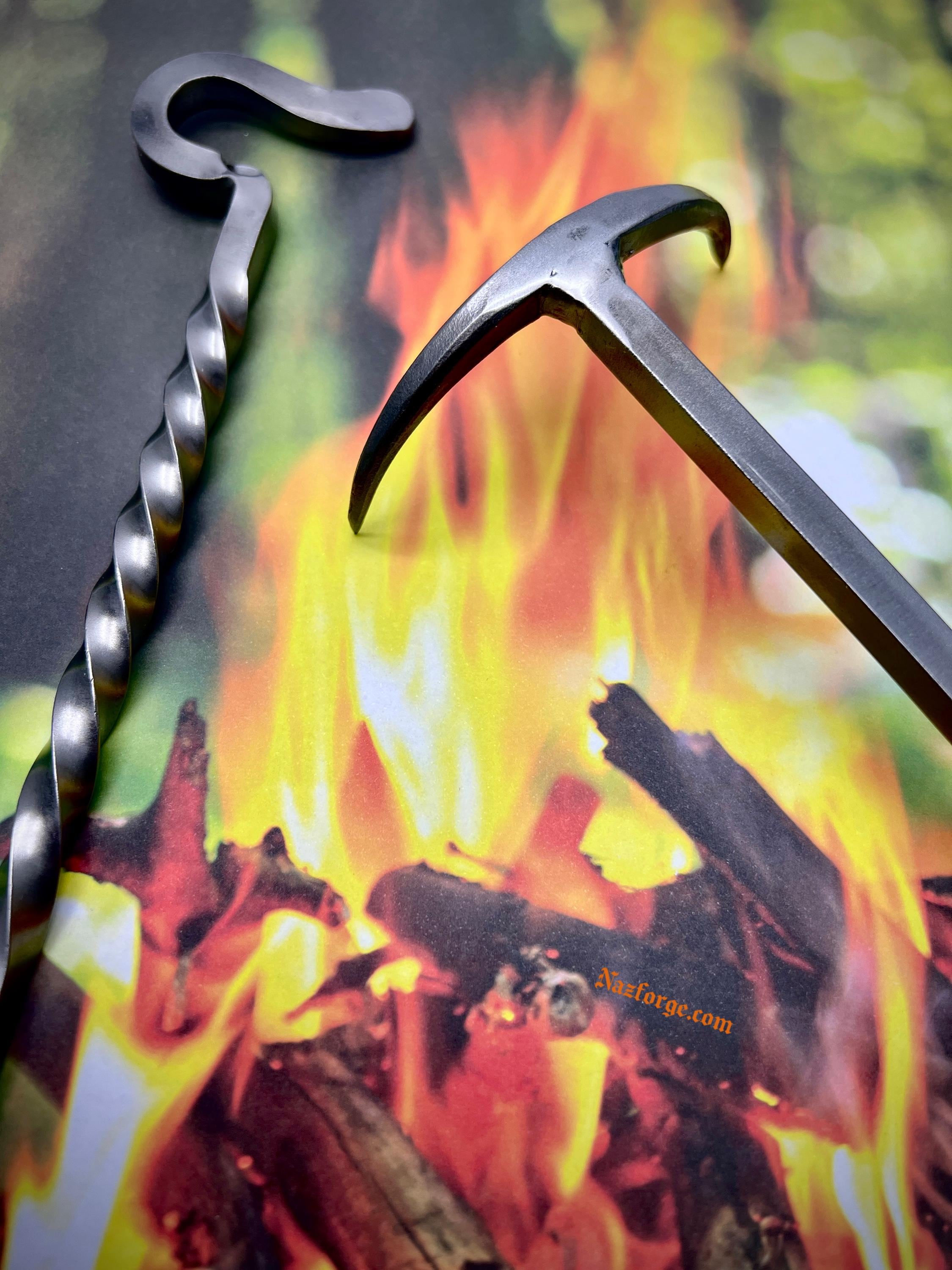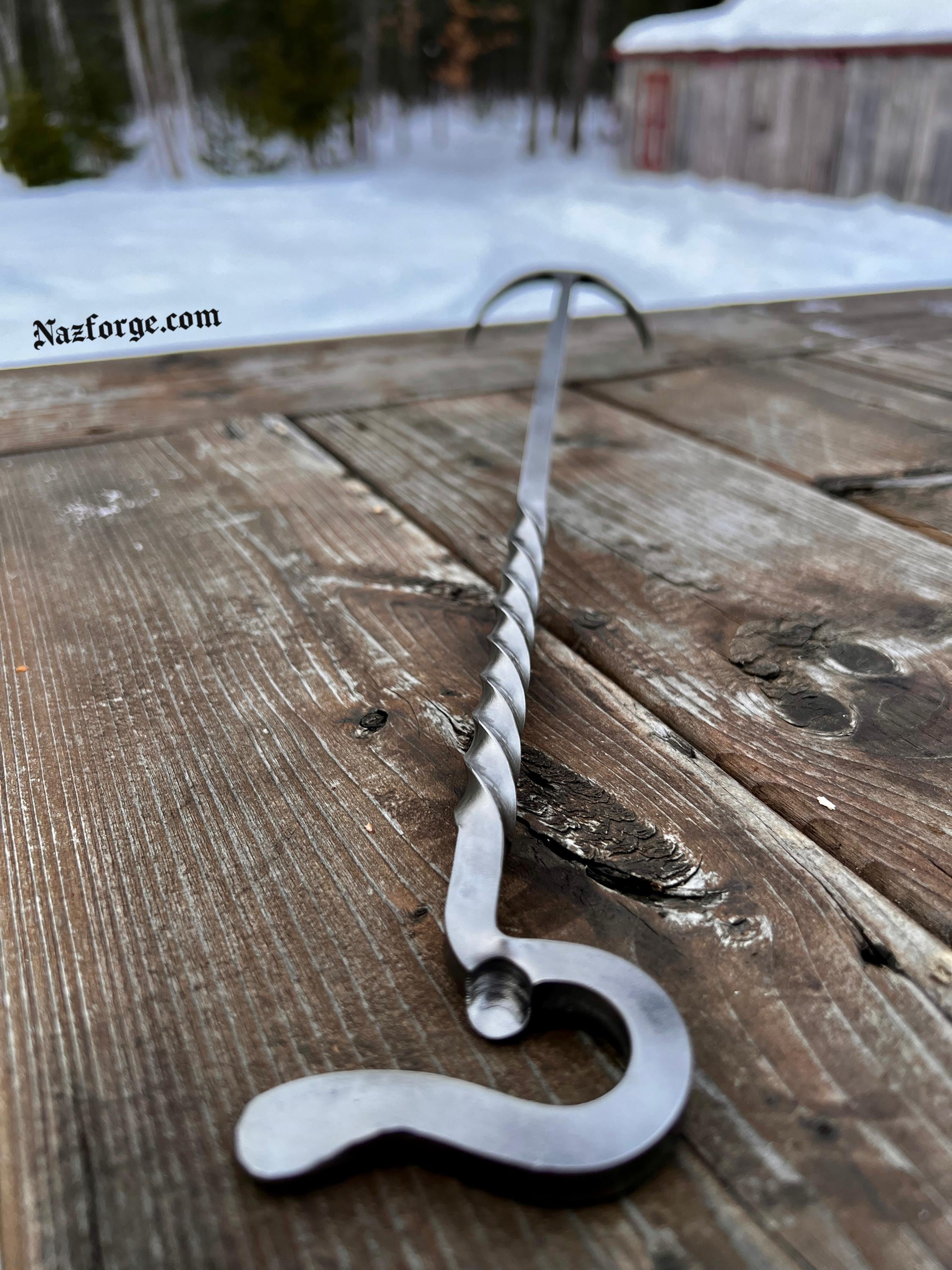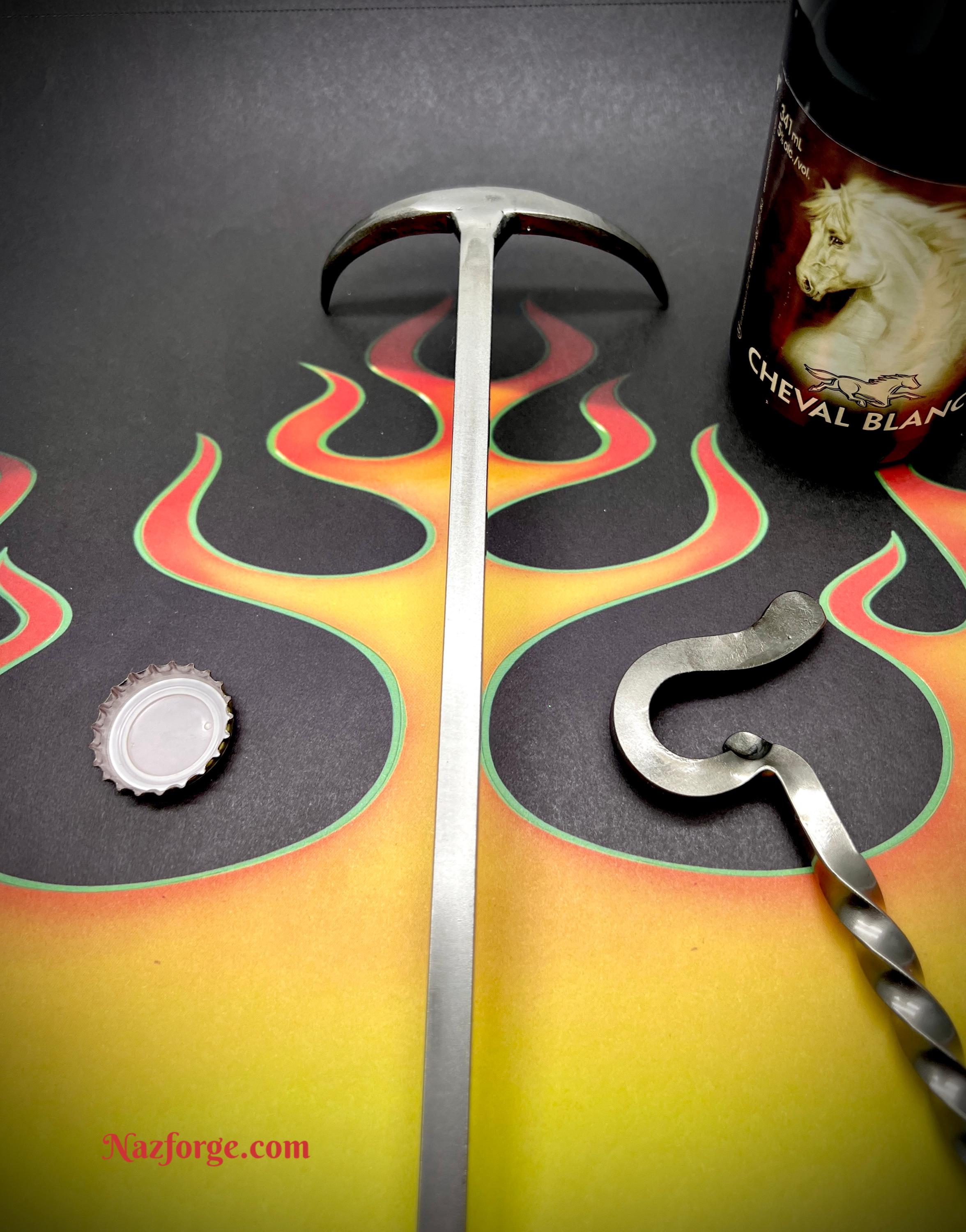 This original tool is hand forged in fire and has the versatility on one end to flip meat from the left or right side (which is perfect both for left or right handed persons) and the other end serves as a twisted handle with an incorporated bottle opener.