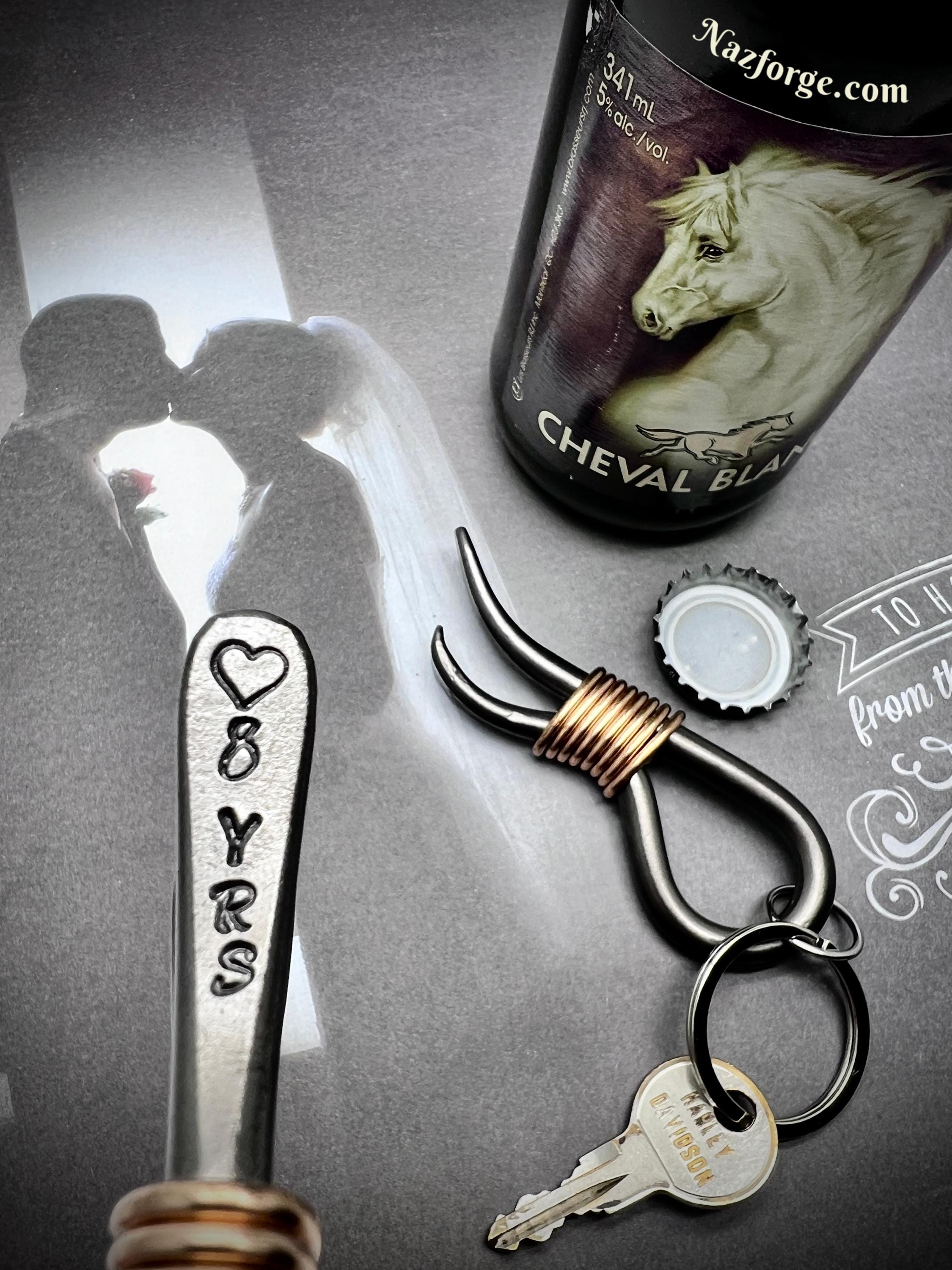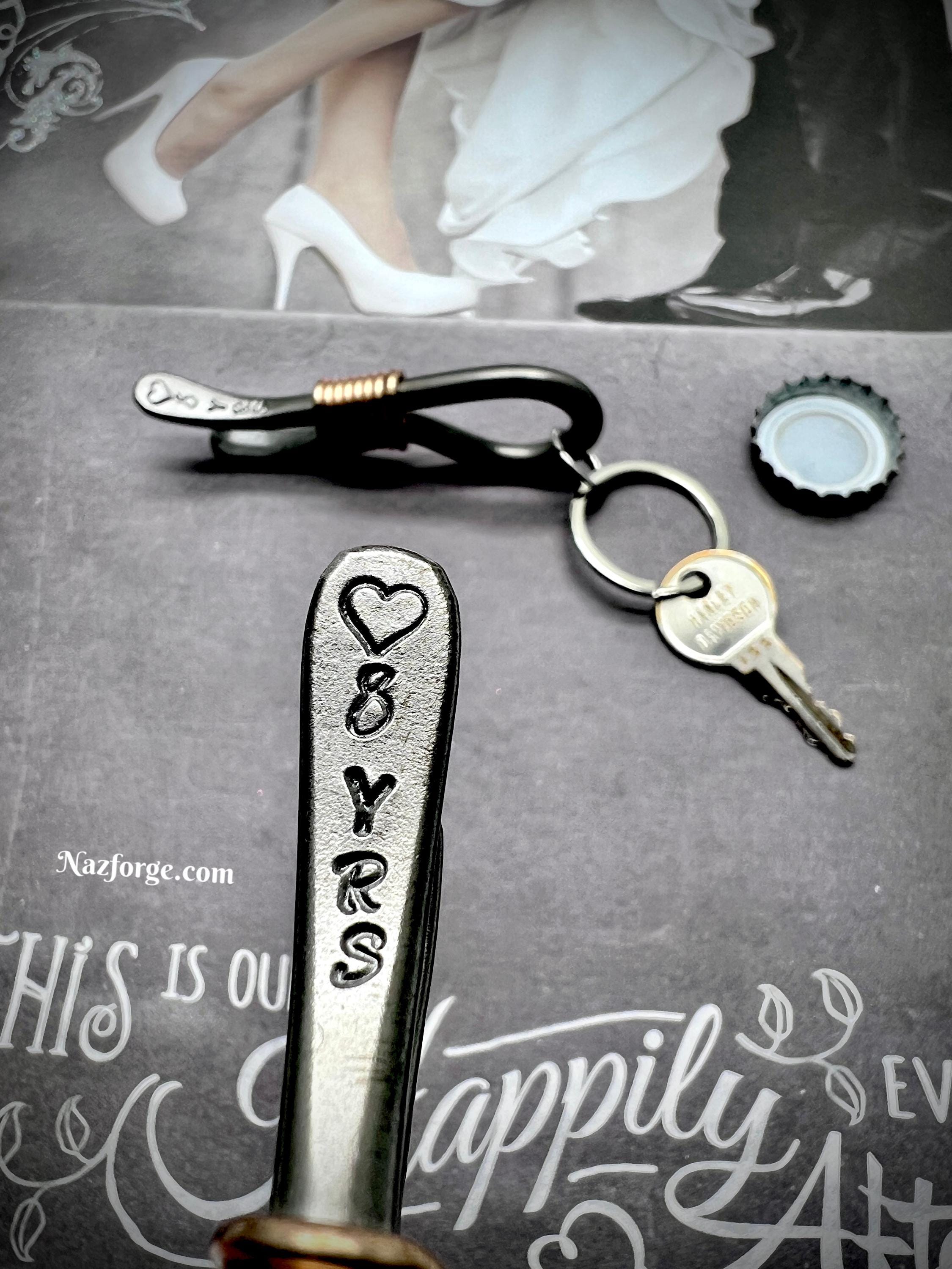 Hand forged, this keychain opener is stamped with "đŸ’— 6 YRS" and ready to ship.