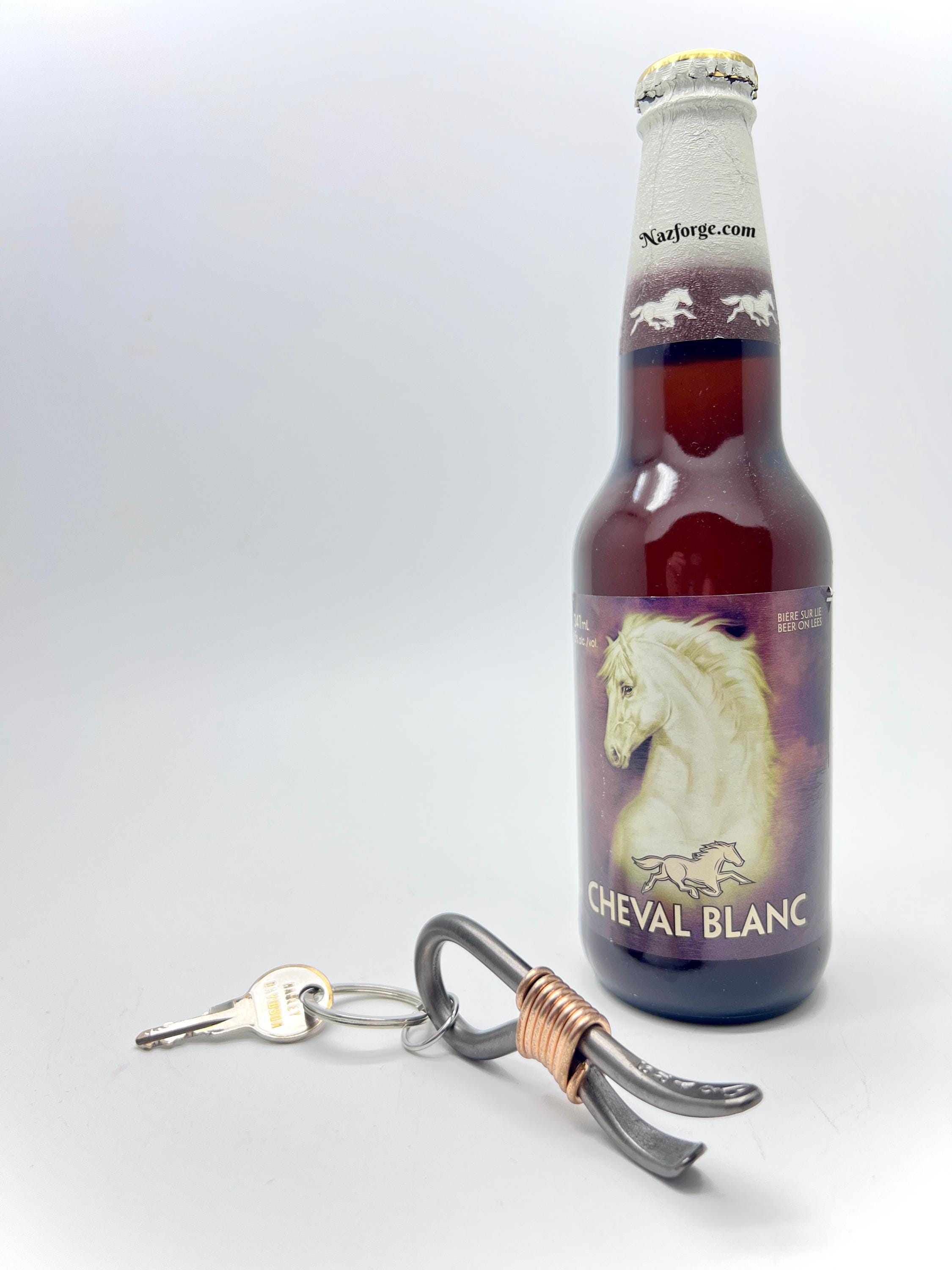 This hand forged keychain bottle opener shows off a decorative copper wrap on the handle.