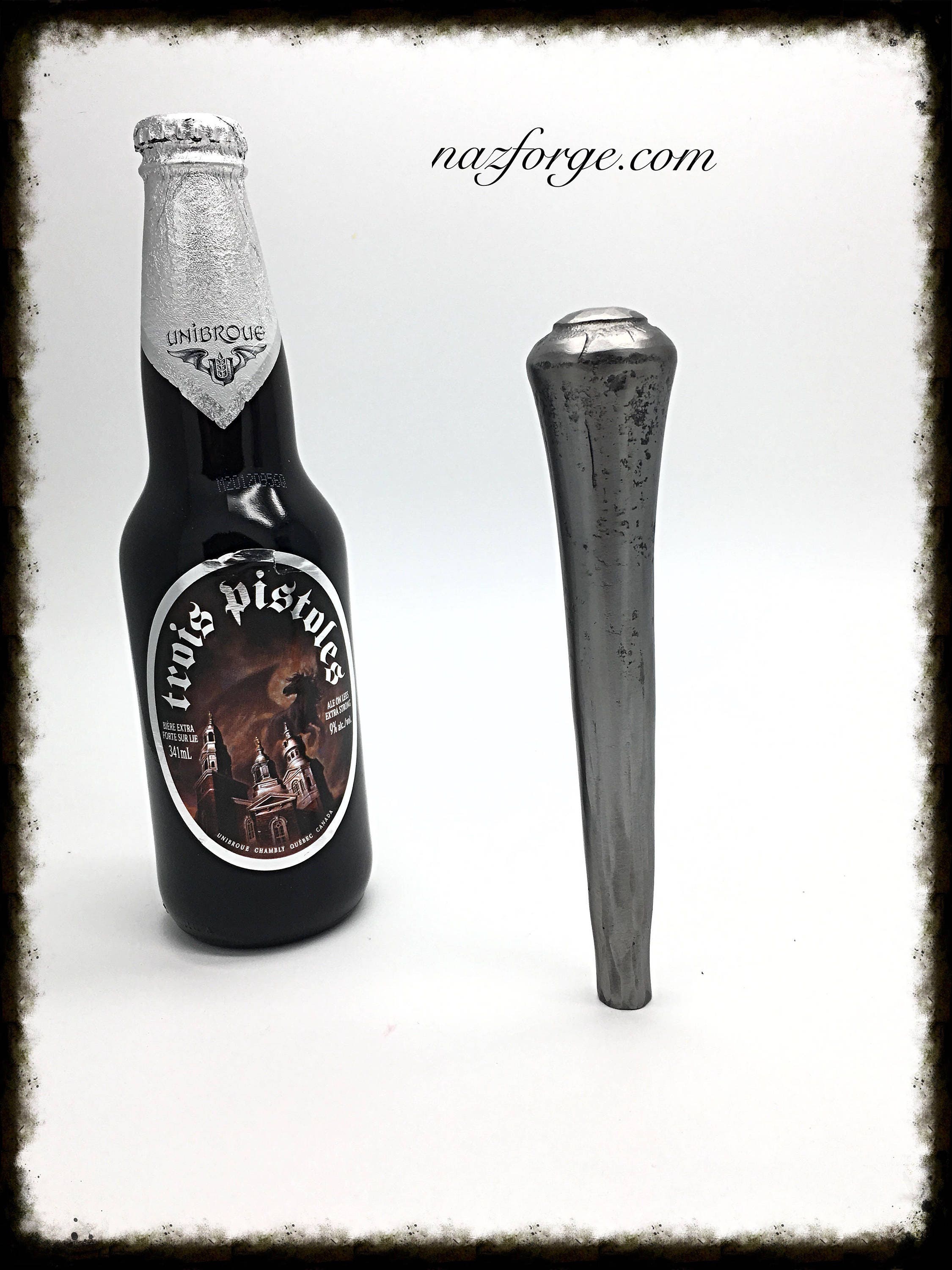 Made from solid iron, this beer tap handle stands at approximately 6-1/2" tall and is approximately 1-3/8" at it's widest...